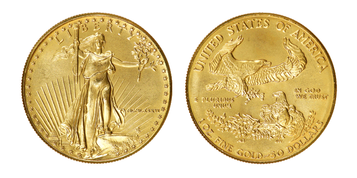 The American Gold Eagle 1 oz coin is the official gold bullion coin of the United States and was first released in 1986. The coin is minted at West Point, NY and contains one troy ounce of .9167 fine gold, or 1 oz actual gold weight. The obverse side is modified from the famous Gold Double Eagle design of Augustus Saint-Gaudens. The reverse from 1986-2021 displays the flying male bald eagle carrying the olive branch to his nest of the female and their young. The Type 2 reverse starting 2021 features a close-up of the American Bald Eagle.