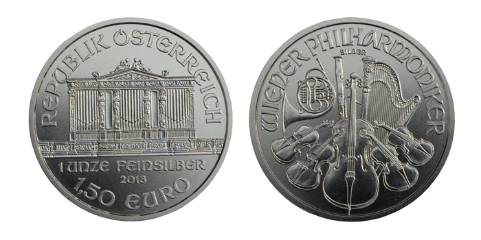 The 1 oz Silver Philharmonic was produced starting in 2008 by the Austrian Mint in .999 fine silver. It features the same design of the Gold version. The obverse is of the Musikverein, the Great Organ of the Golden Hall in Vienna's concert hall along with the year, weight, and face value. The reverse displays several instruments including the cello, violin, harp, Vienna horn and bassoon.