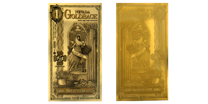 The 1 Goldback is the base unit for the Goldback currency. It contains 1/1000th oz of gold embedded in a brilliant and familiar note-like form. Other Goldback units include the 5, 10, 25, and 50 Goldback. Its design and form meets the demand of a stable currency for all which is the greatest utility of precious metals.